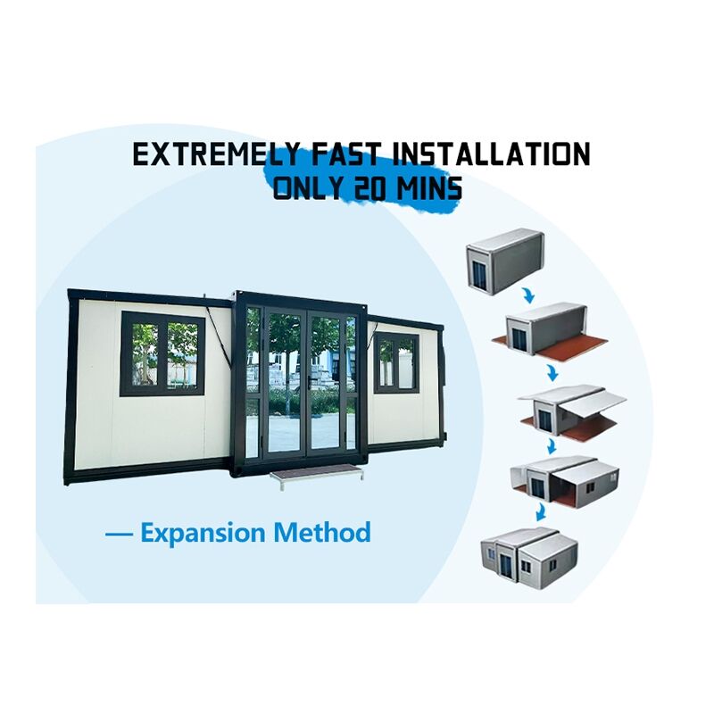 The 20ft Rumah kontainer dapat diperluas adalah bangunan modular inovatif dengan kontainer standar sebagai struktur dasar dan dilengkapi dengan "panel sayap" yang dapat dibentangkan di kedua sisi. Setelah dilipat keluar, luas area dalam ruangan dapat diperbesar secara signifikan, menggabungkan portabilitas dan fleksibilitas ruang.